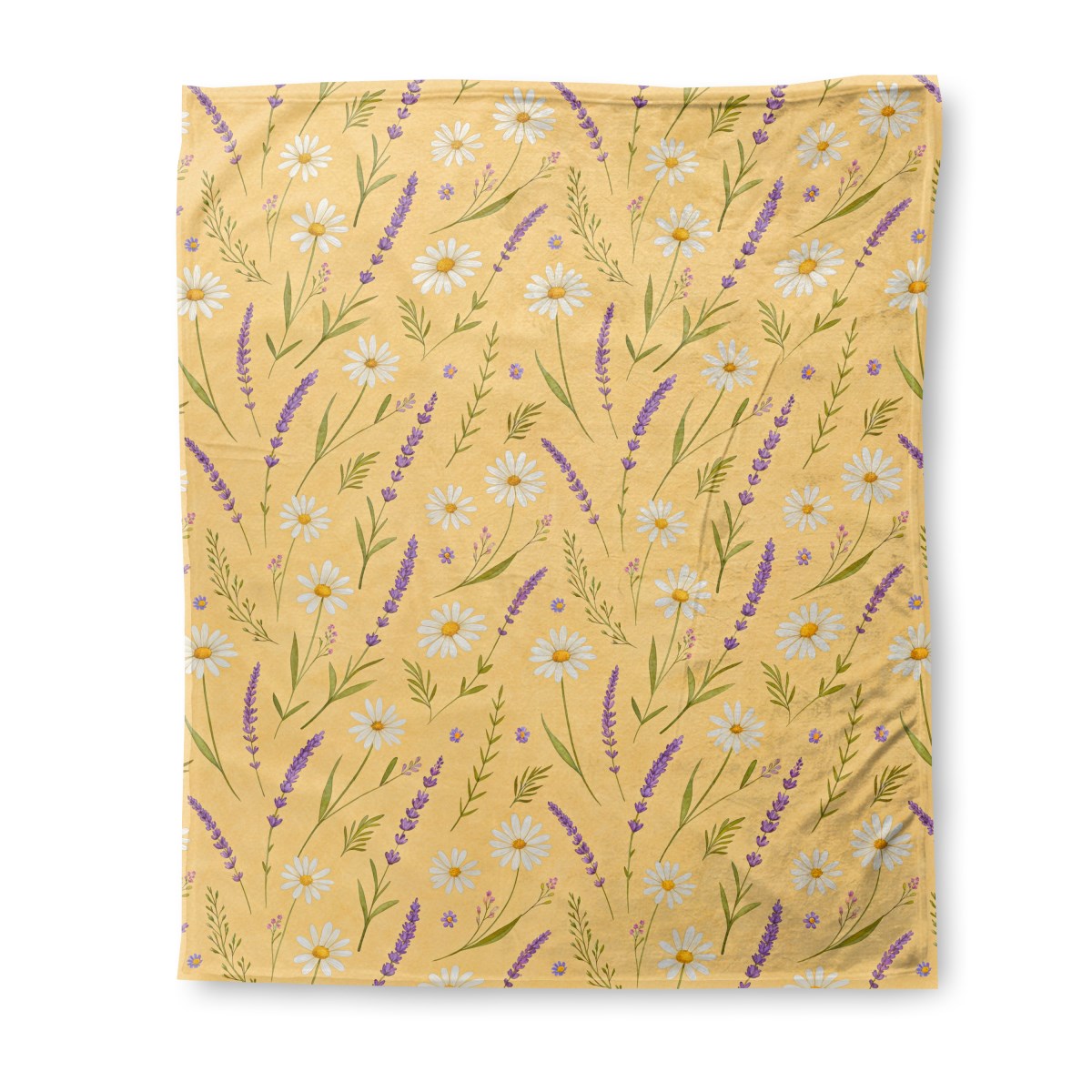 A seamless floral pattern in a watercolor style, featuring white daisies and purple lavender sprigs scattered across a warm, textured yellow background. The design creates a gentle and charming botanical feel.