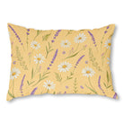 A seamless floral pattern in a watercolor style, featuring white daisies and purple lavender sprigs scattered across a warm, textured yellow background. The design creates a gentle and charming botanical feel.