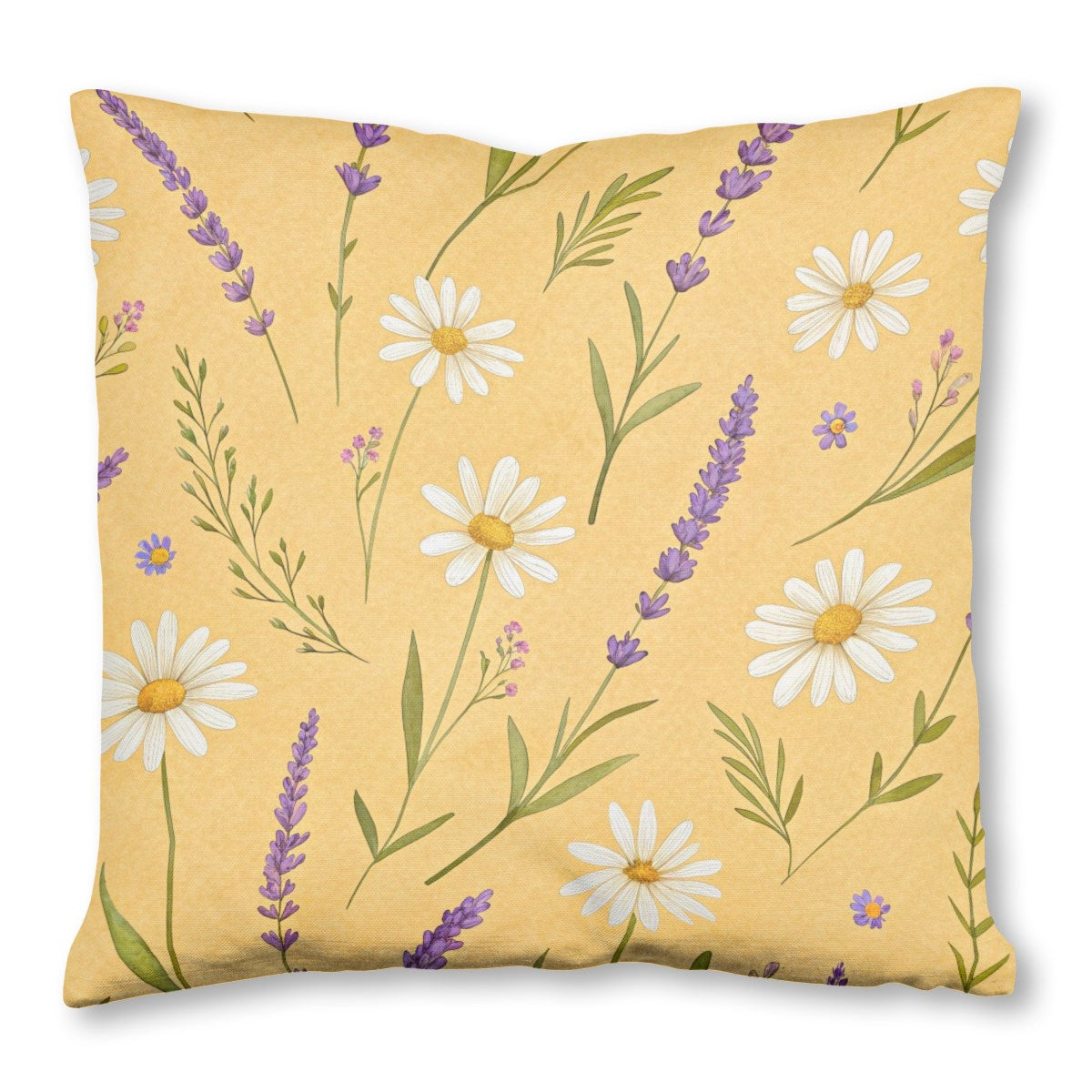 A seamless floral pattern in a watercolor style, featuring white daisies and purple lavender sprigs scattered across a warm, textured yellow background. The design creates a gentle and charming botanical feel.