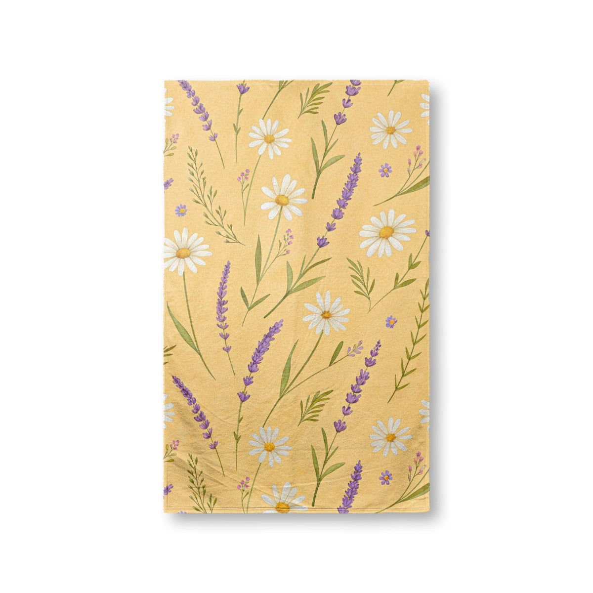 A seamless floral pattern in a watercolor style, featuring white daisies and purple lavender sprigs scattered across a warm, textured yellow background. The design creates a gentle and charming botanical feel.