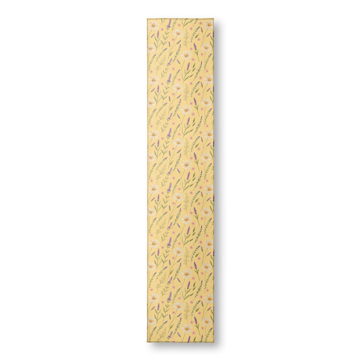 A charming, watercolor-style floral pattern on a soft yellow background. The design features scattered white daisies, sprigs of purple lavender, and small pink blossoms, creating a gentle and rustic feel.