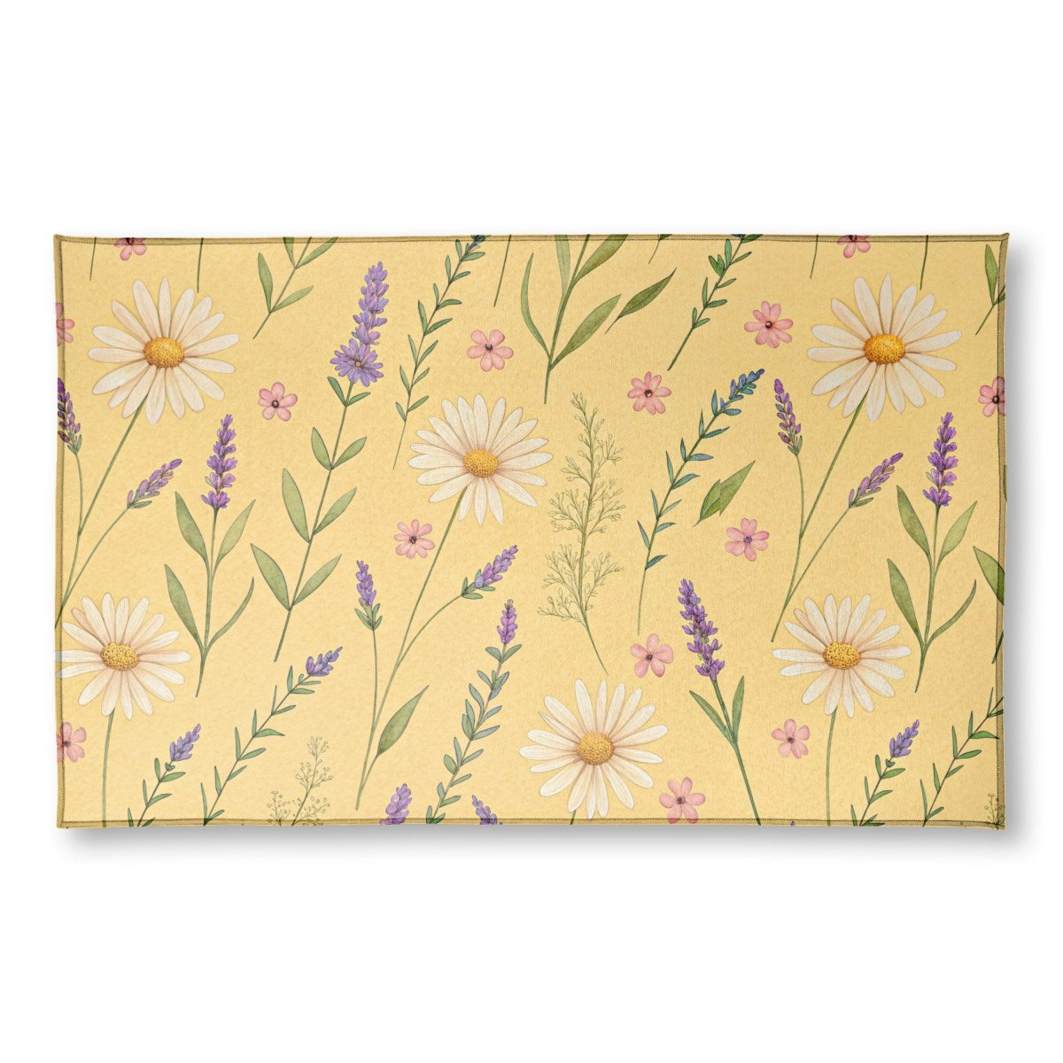 A charming, watercolor-style floral pattern on a soft yellow background. The design features scattered white daisies, sprigs of purple lavender, and small pink blossoms, creating a gentle and rustic feel.