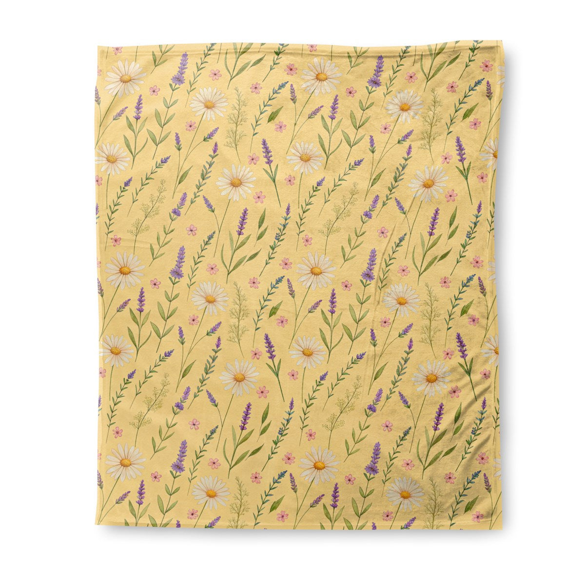 A charming, watercolor-style floral pattern on a soft yellow background. The design features scattered white daisies, sprigs of purple lavender, and small pink blossoms, creating a gentle and rustic feel.