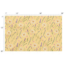 A charming, watercolor-style floral pattern on a soft yellow background. The design features scattered white daisies, sprigs of purple lavender, and small pink blossoms, creating a gentle and rustic feel.