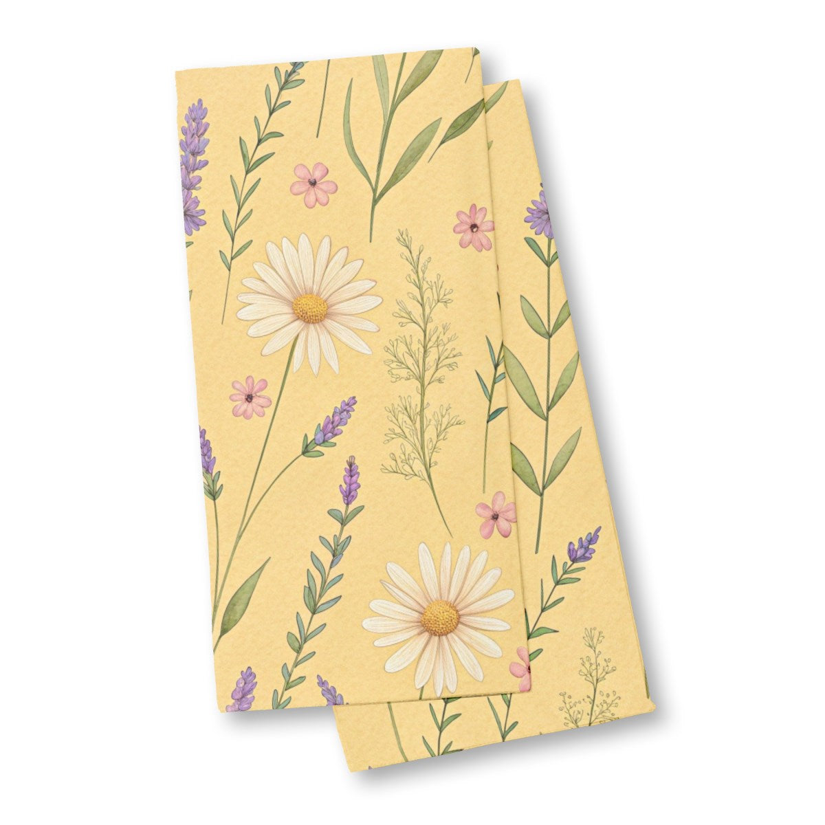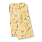 A charming, watercolor-style floral pattern on a soft yellow background. The design features scattered white daisies, sprigs of purple lavender, and small pink blossoms, creating a gentle and rustic feel.