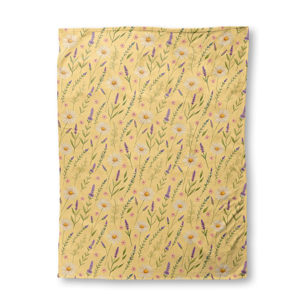 A charming, watercolor-style floral pattern on a soft yellow background. The design features scattered white daisies, sprigs of purple lavender, and small pink blossoms, creating a gentle and rustic feel.