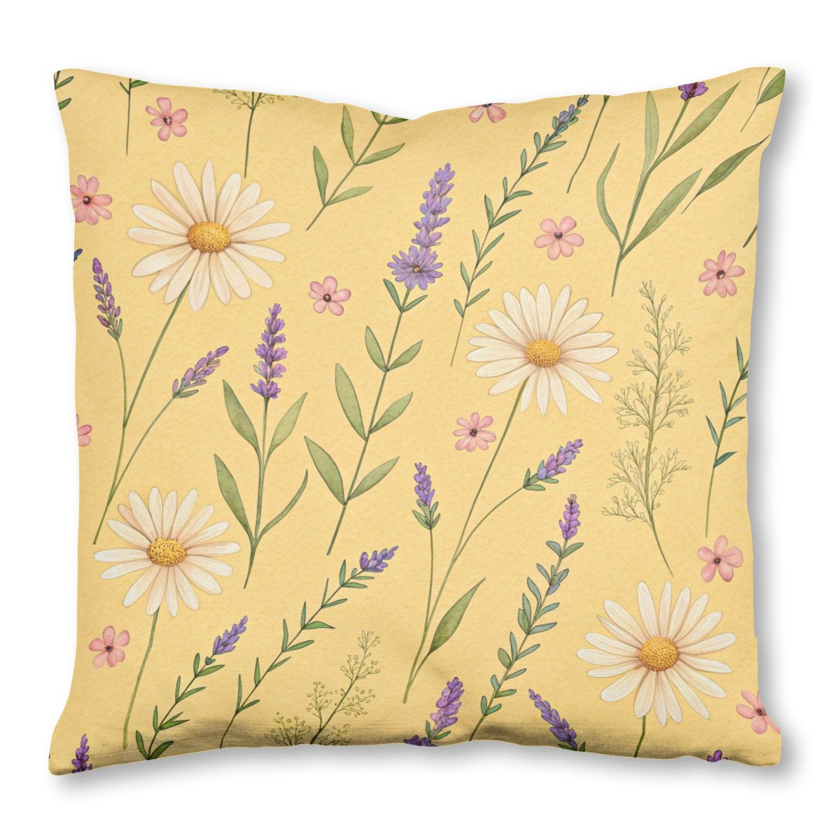 A charming, watercolor-style floral pattern on a soft yellow background. The design features scattered white daisies, sprigs of purple lavender, and small pink blossoms, creating a gentle and rustic feel.