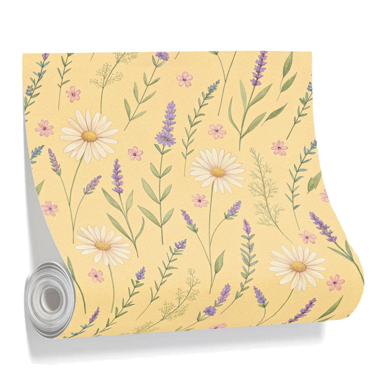 A charming, watercolor-style floral pattern on a soft yellow background. The design features scattered white daisies, sprigs of purple lavender, and small pink blossoms, creating a gentle and rustic feel.