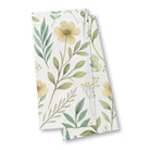 A delicate watercolor illustration of a seamless botanical pattern. Soft yellow and light green flowers are scattered amongst various green leaves and stems on a white background, creating a light, airy, and natural design.
