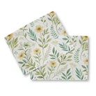 A delicate watercolor illustration of a seamless botanical pattern. Soft yellow and light green flowers are scattered amongst various green leaves and stems on a white background, creating a light, airy, and natural design.
