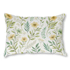 A delicate watercolor illustration of a seamless botanical pattern. Soft yellow and light green flowers are scattered amongst various green leaves and stems on a white background, creating a light, airy, and natural design.