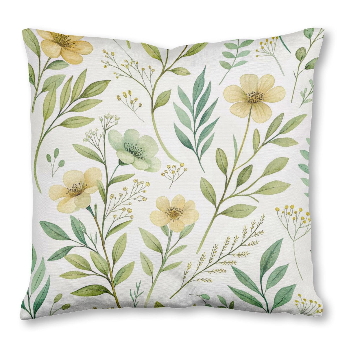 A delicate watercolor illustration of a seamless botanical pattern. Soft yellow and light green flowers are scattered amongst various green leaves and stems on a white background, creating a light, airy, and natural design.