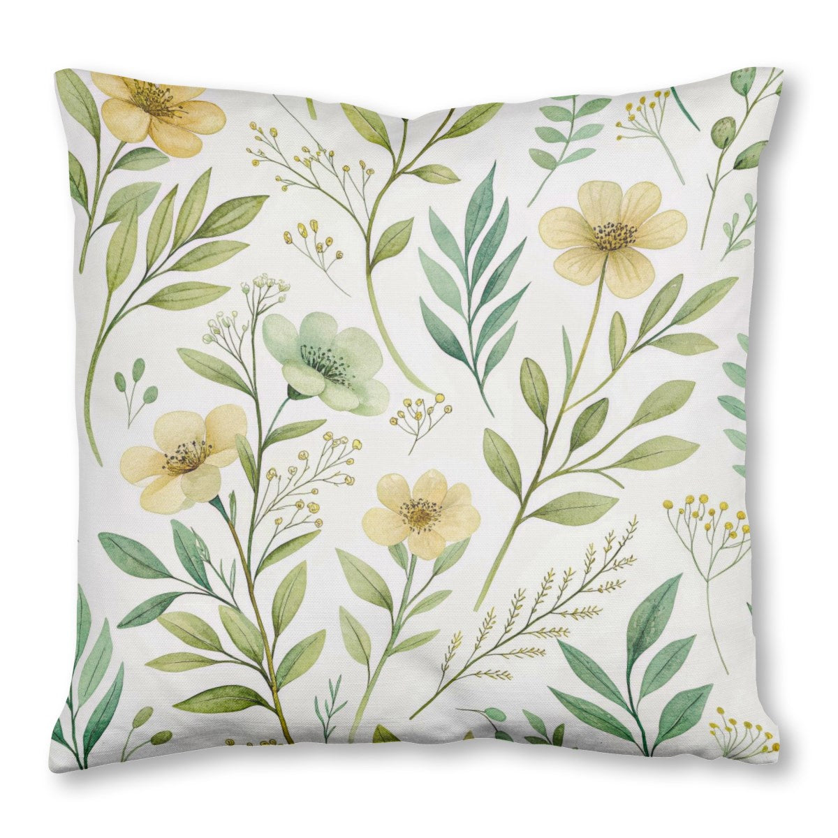 A delicate watercolor illustration of a seamless botanical pattern. Soft yellow and light green flowers are scattered amongst various green leaves and stems on a white background, creating a light, airy, and natural design.