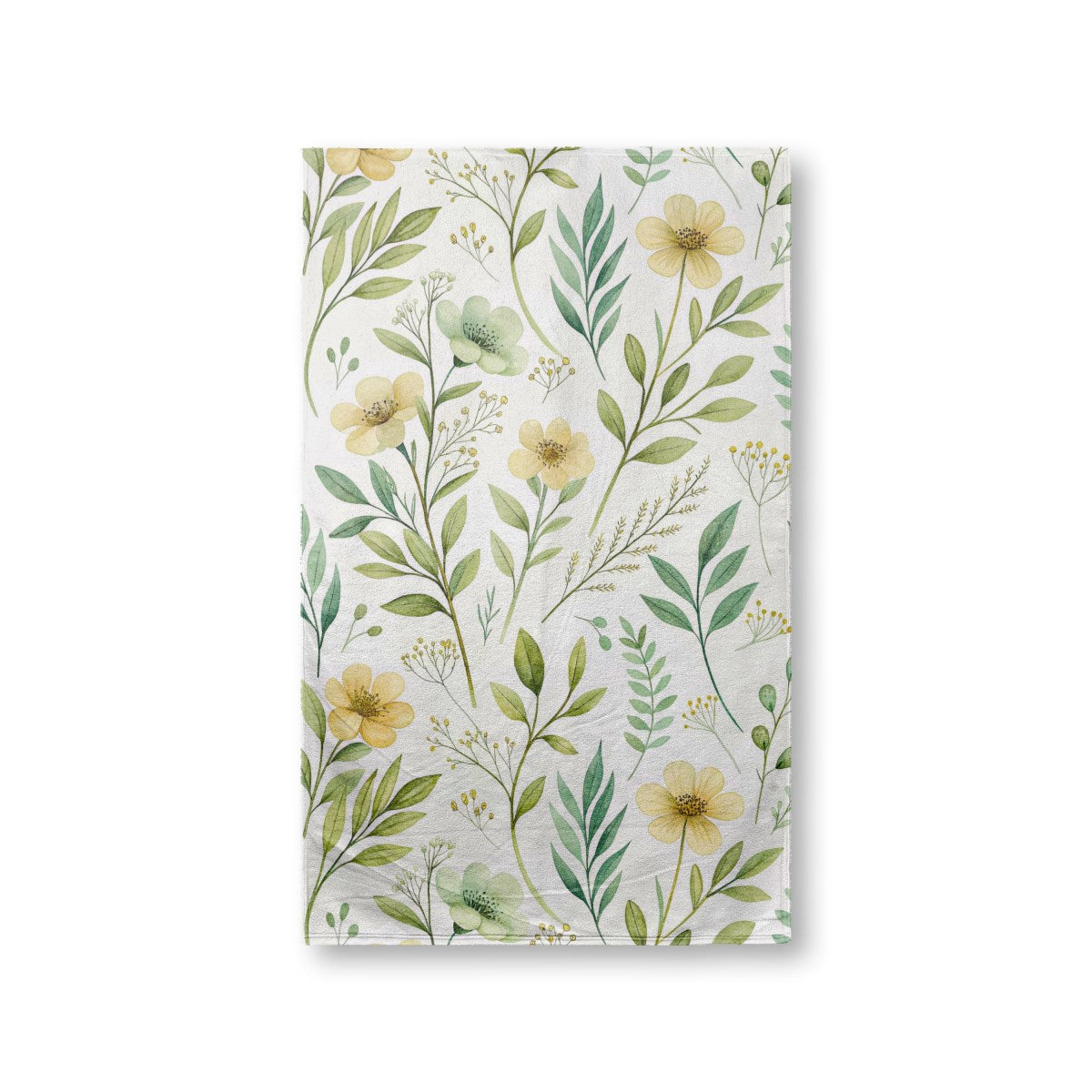 A delicate watercolor illustration of a seamless botanical pattern. Soft yellow and light green flowers are scattered amongst various green leaves and stems on a white background, creating a light, airy, and natural design.