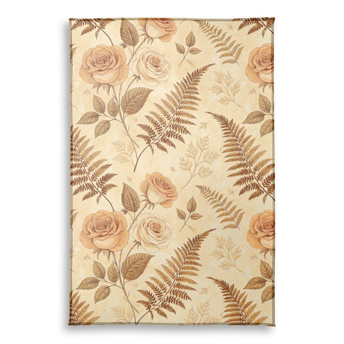 A vintage-style botanical pattern features elegant roses and fern leaves. The illustrations are rendered in a warm, monochromatic palette of sepia and brown tones on a light, parchment-like background, creating a delicate and timeless seamless design.