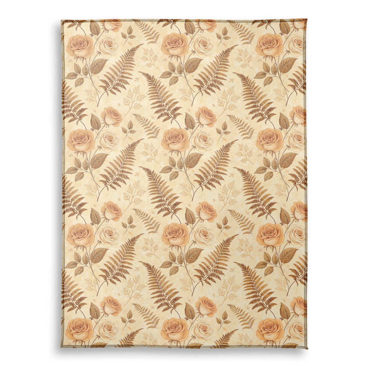 A vintage-style botanical pattern features elegant roses and fern leaves. The illustrations are rendered in a warm, monochromatic palette of sepia and brown tones on a light, parchment-like background, creating a delicate and timeless seamless design.