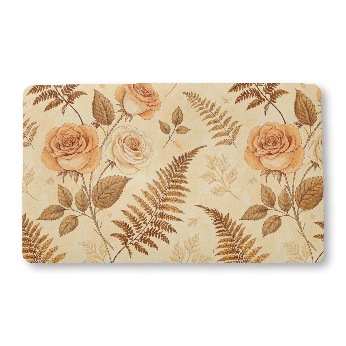 A vintage-style botanical pattern features elegant roses and fern leaves. The illustrations are rendered in a warm, monochromatic palette of sepia and brown tones on a light, parchment-like background, creating a delicate and timeless seamless design.