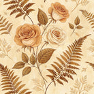 A vintage-style botanical pattern features elegant roses and fern leaves. The illustrations are rendered in a warm, monochromatic palette of sepia and brown tones on a light, parchment-like background, creating a delicate and timeless seamless design.