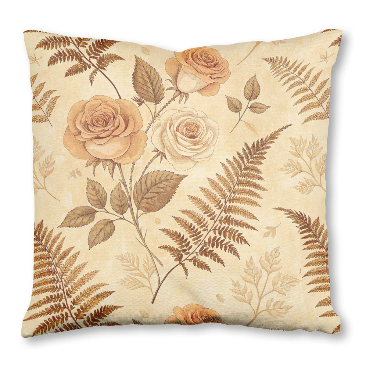 A vintage-style botanical pattern features elegant roses and fern leaves. The illustrations are rendered in a warm, monochromatic palette of sepia and brown tones on a light, parchment-like background, creating a delicate and timeless seamless design.