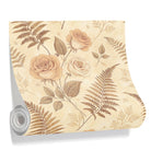 A vintage-style botanical pattern features elegant roses and fern leaves. The illustrations are rendered in a warm, monochromatic palette of sepia and brown tones on a light, parchment-like background, creating a delicate and timeless seamless design.