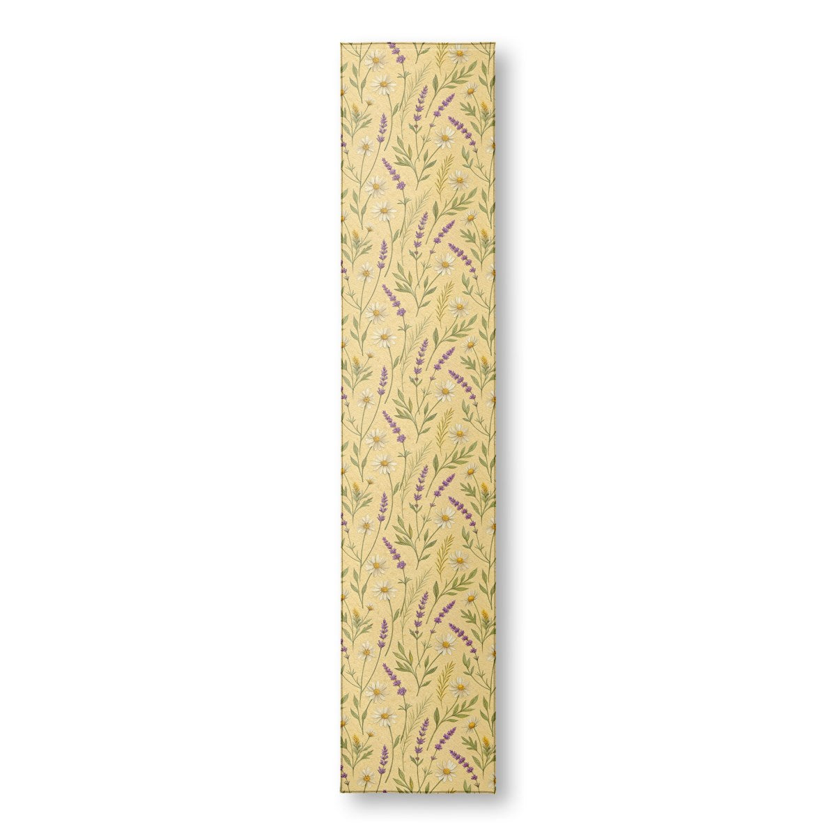 A vintage botanical illustration features a seamless pattern of white daisies and purple lavender. The delicate wildflowers are depicted in a watercolor style against a textured, warm-yellow paper background, giving it a charming, rustic feel.