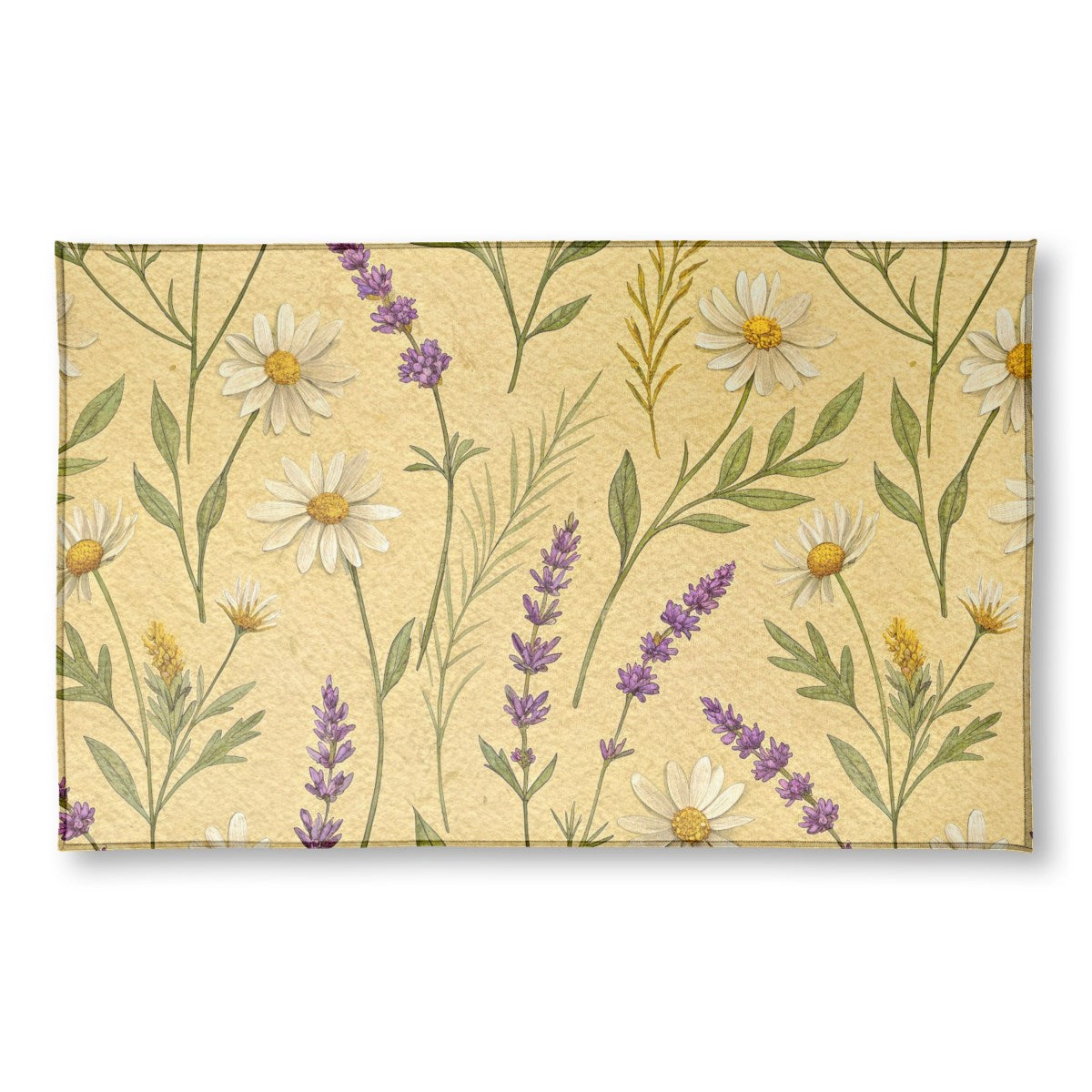 A vintage botanical illustration features a seamless pattern of white daisies and purple lavender. The delicate wildflowers are depicted in a watercolor style against a textured, warm-yellow paper background, giving it a charming, rustic feel.