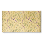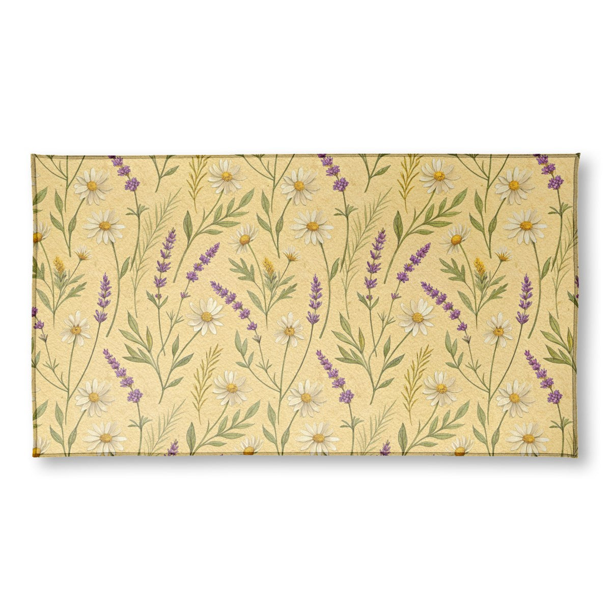 A vintage botanical illustration features a seamless pattern of white daisies and purple lavender. The delicate wildflowers are depicted in a watercolor style against a textured, warm-yellow paper background, giving it a charming, rustic feel.