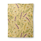 A vintage botanical illustration features a seamless pattern of white daisies and purple lavender. The delicate wildflowers are depicted in a watercolor style against a textured, warm-yellow paper background, giving it a charming, rustic feel.