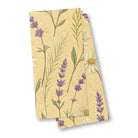 A vintage botanical illustration features a seamless pattern of white daisies and purple lavender. The delicate wildflowers are depicted in a watercolor style against a textured, warm-yellow paper background, giving it a charming, rustic feel.