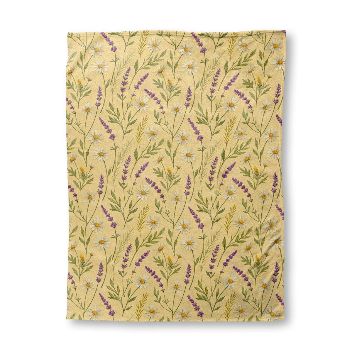 A vintage botanical illustration features a seamless pattern of white daisies and purple lavender. The delicate wildflowers are depicted in a watercolor style against a textured, warm-yellow paper background, giving it a charming, rustic feel.