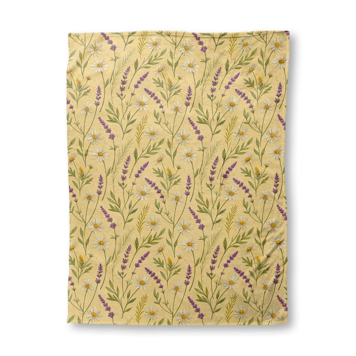 A vintage botanical illustration features a seamless pattern of white daisies and purple lavender. The delicate wildflowers are depicted in a watercolor style against a textured, warm-yellow paper background, giving it a charming, rustic feel.