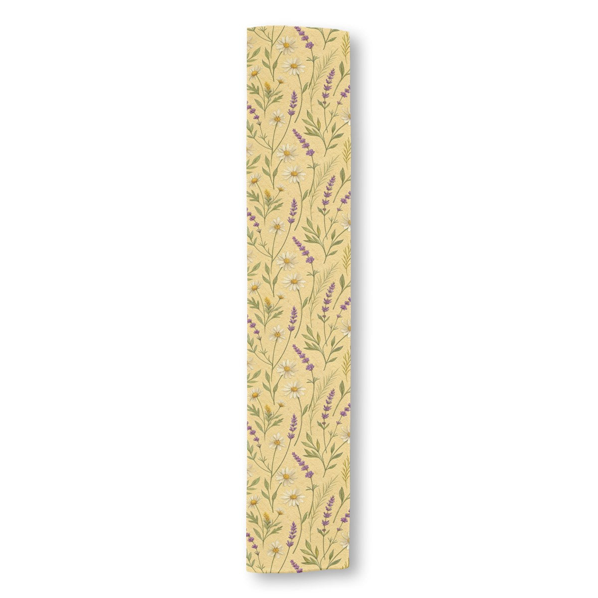 A vintage botanical illustration features a seamless pattern of white daisies and purple lavender. The delicate wildflowers are depicted in a watercolor style against a textured, warm-yellow paper background, giving it a charming, rustic feel.