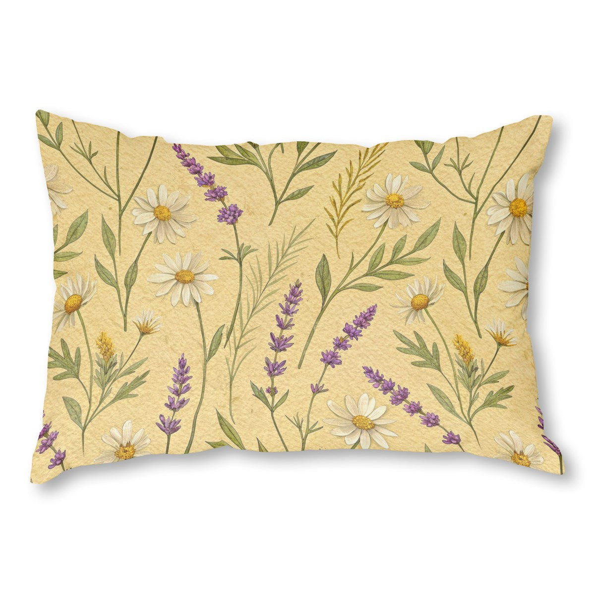 A vintage botanical illustration features a seamless pattern of white daisies and purple lavender. The delicate wildflowers are depicted in a watercolor style against a textured, warm-yellow paper background, giving it a charming, rustic feel.