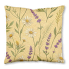 A vintage botanical illustration features a seamless pattern of white daisies and purple lavender. The delicate wildflowers are depicted in a watercolor style against a textured, warm-yellow paper background, giving it a charming, rustic feel.