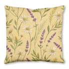 A vintage botanical illustration features a seamless pattern of white daisies and purple lavender. The delicate wildflowers are depicted in a watercolor style against a textured, warm-yellow paper background, giving it a charming, rustic feel.