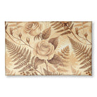 This is a vintage-style botanical illustration featuring a seamless pattern of detailed roses and fern leaves. The entire image is rendered in monochromatic sepia and brown tones, giving it a classic, antique appearance on a textured, parchment-like background.