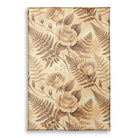 This is a vintage-style botanical illustration featuring a seamless pattern of detailed roses and fern leaves. The entire image is rendered in monochromatic sepia and brown tones, giving it a classic, antique appearance on a textured, parchment-like background.