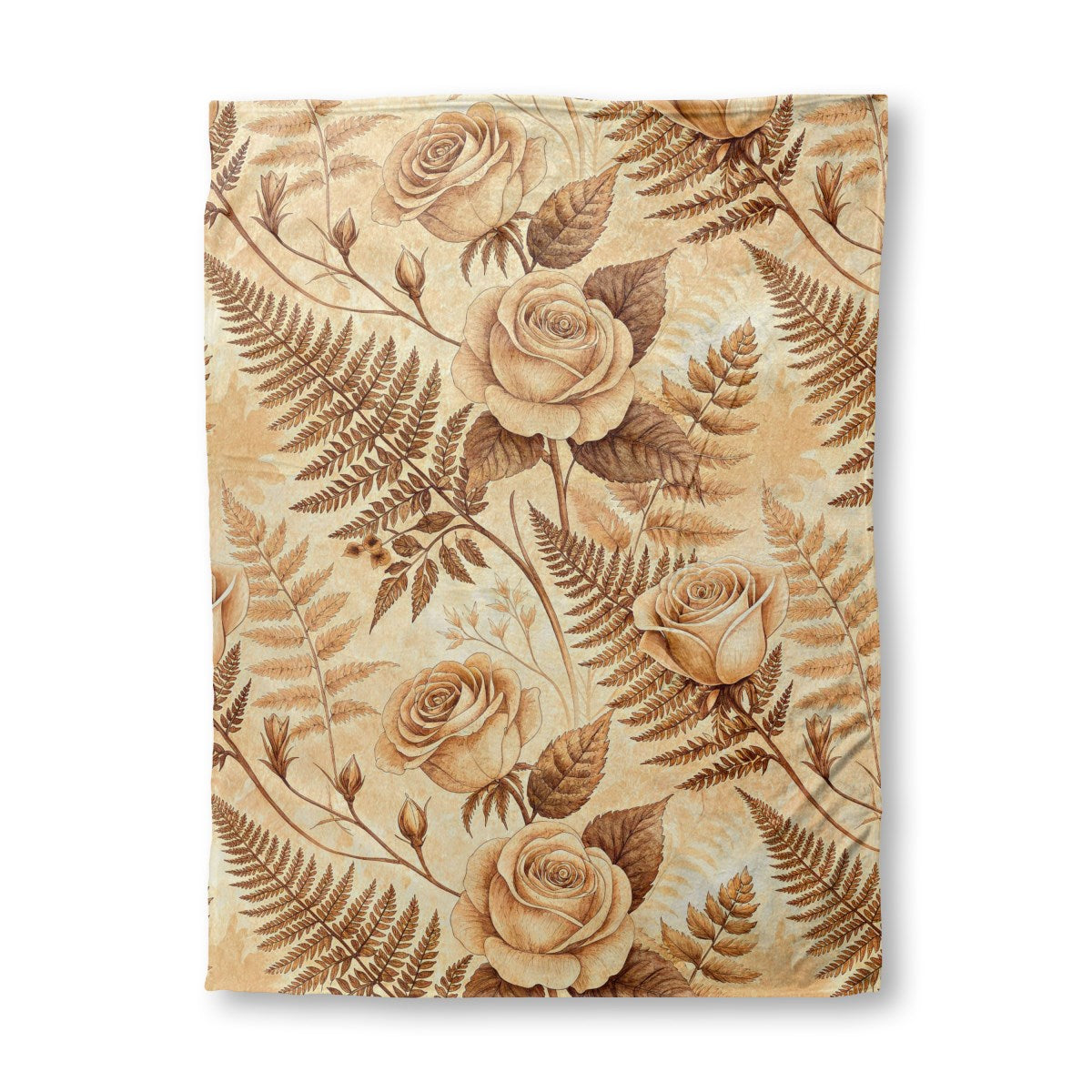 This is a vintage-style botanical illustration featuring a seamless pattern of detailed roses and fern leaves. The entire image is rendered in monochromatic sepia and brown tones, giving it a classic, antique appearance on a textured, parchment-like background.