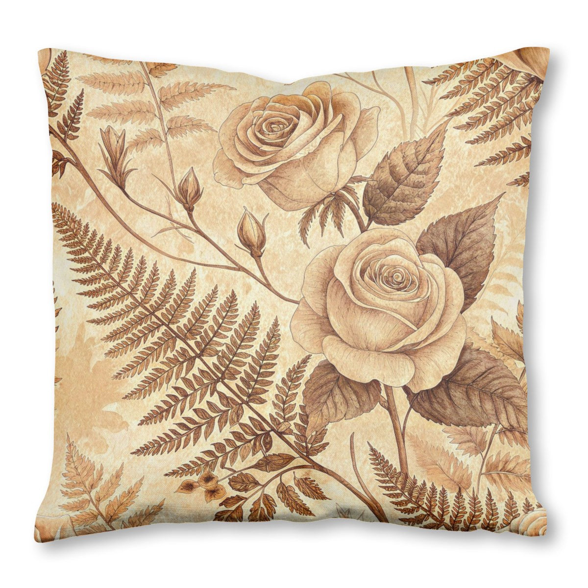 This is a vintage-style botanical illustration featuring a seamless pattern of detailed roses and fern leaves. The entire image is rendered in monochromatic sepia and brown tones, giving it a classic, antique appearance on a textured, parchment-like background.