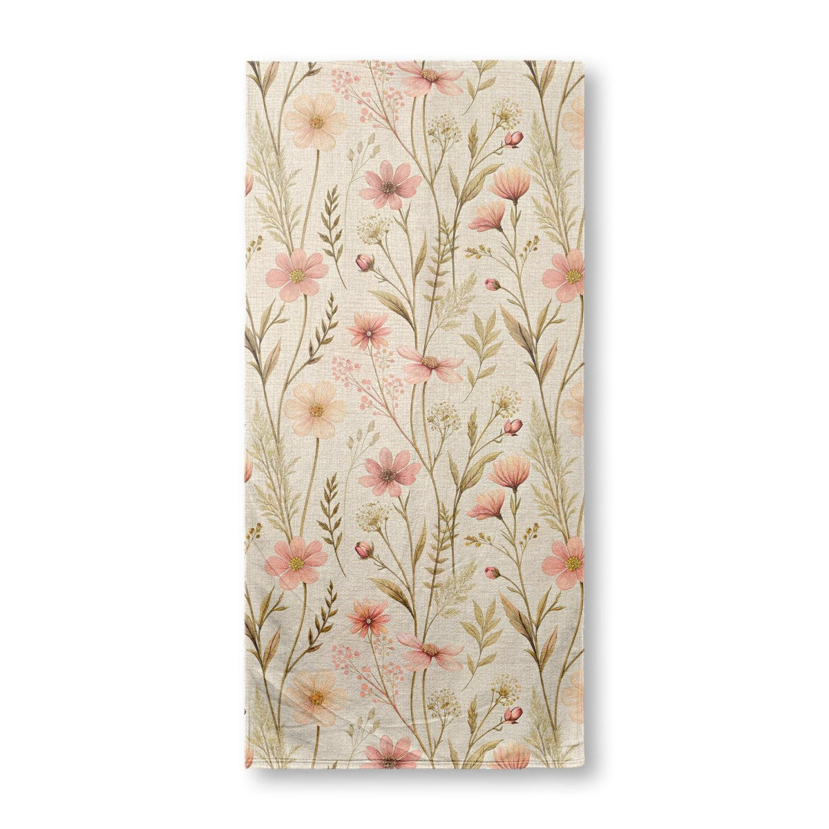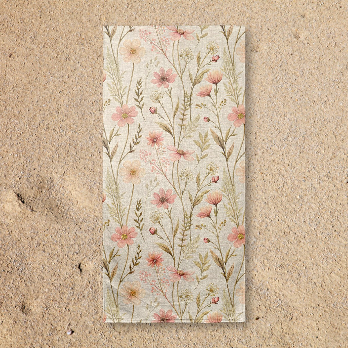 A vintage-style botanical pattern of delicate watercolor wildflowers. The soft pink blossoms and earthy green foliage are set against a light, textured background, creating a rustic and gentle aesthetic.
