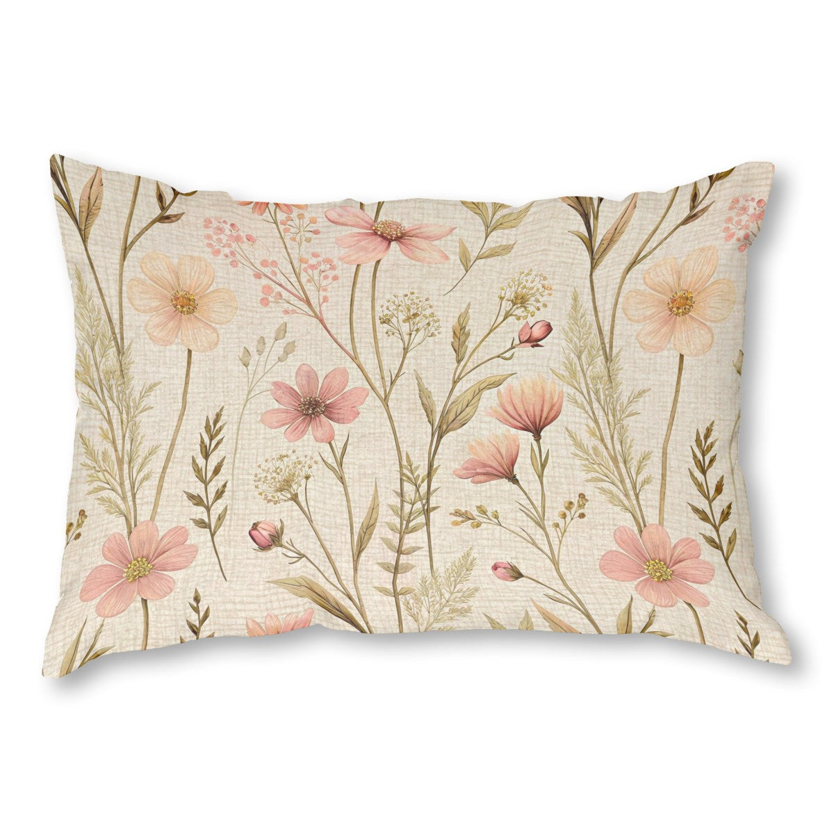 A vintage-style botanical pattern of delicate watercolor wildflowers. The soft pink blossoms and earthy green foliage are set against a light, textured background, creating a rustic and gentle aesthetic.