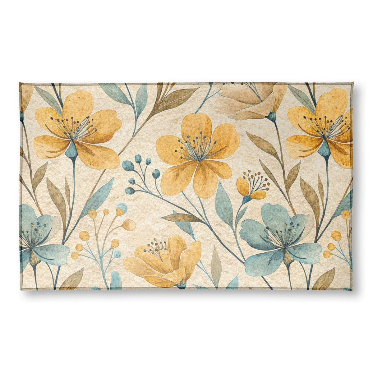 A rustic, watercolor-style floral pattern with a vintage feel. The design features stylized golden-yellow and dusty-blue flowers with delicate leaves and stems in earthy tones, all set against a textured, light beige background.