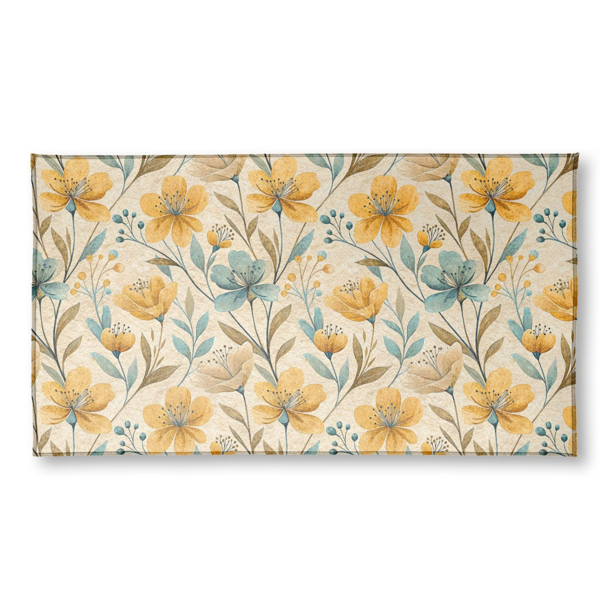 A rustic, watercolor-style floral pattern with a vintage feel. The design features stylized golden-yellow and dusty-blue flowers with delicate leaves and stems in earthy tones, all set against a textured, light beige background.