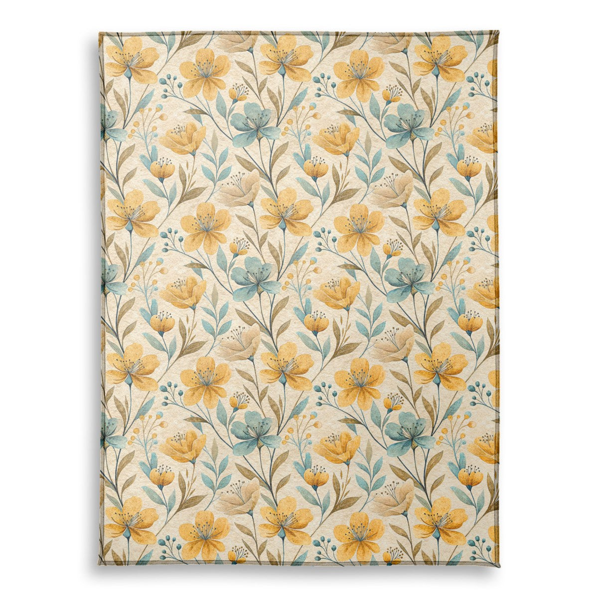 A rustic, watercolor-style floral pattern with a vintage feel. The design features stylized golden-yellow and dusty-blue flowers with delicate leaves and stems in earthy tones, all set against a textured, light beige background.