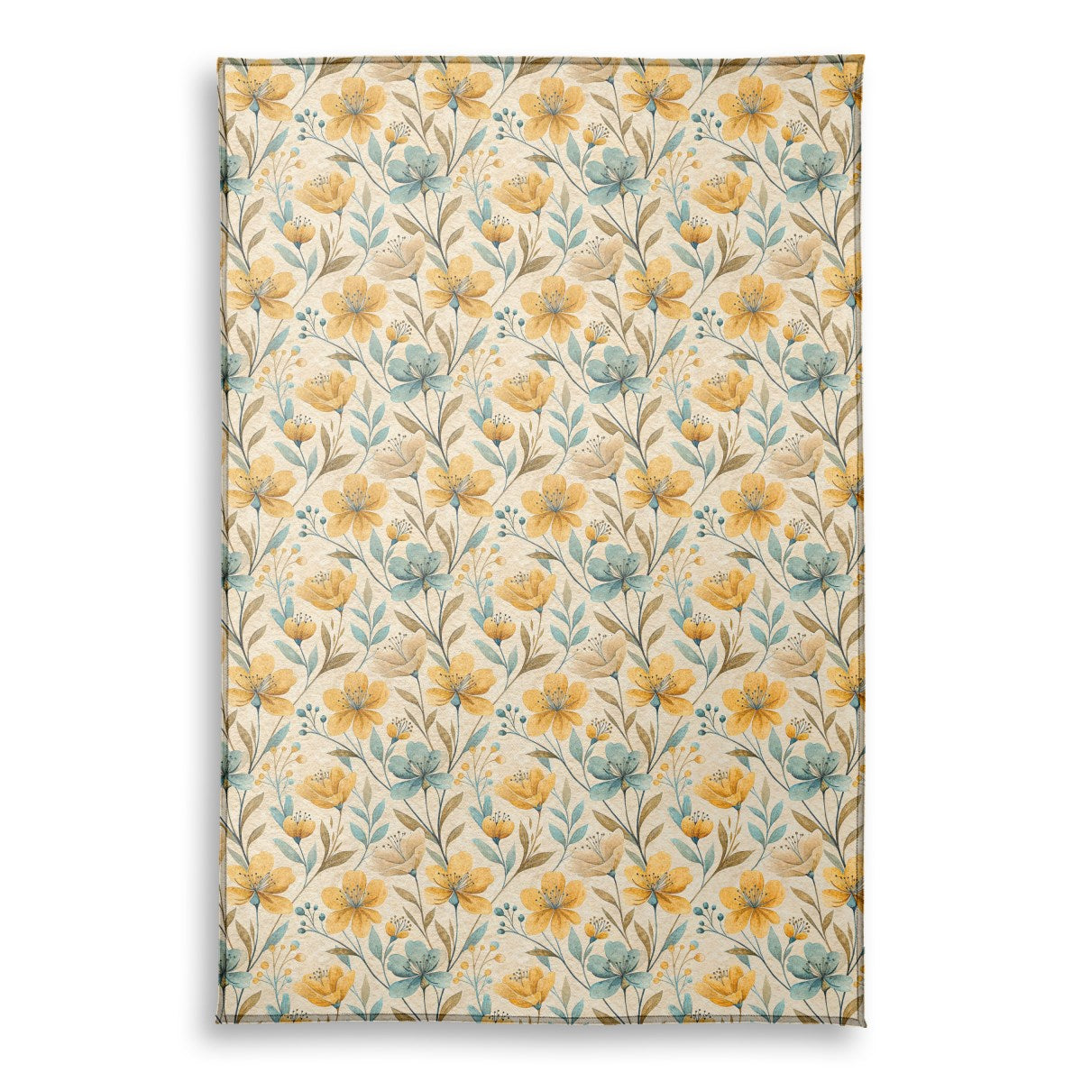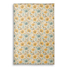 A rustic, watercolor-style floral pattern with a vintage feel. The design features stylized golden-yellow and dusty-blue flowers with delicate leaves and stems in earthy tones, all set against a textured, light beige background.