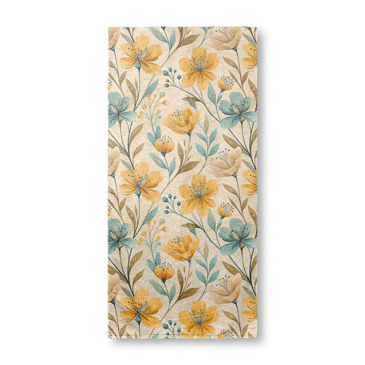 A rustic, watercolor-style floral pattern with a vintage feel. The design features stylized golden-yellow and dusty-blue flowers with delicate leaves and stems in earthy tones, all set against a textured, light beige background.