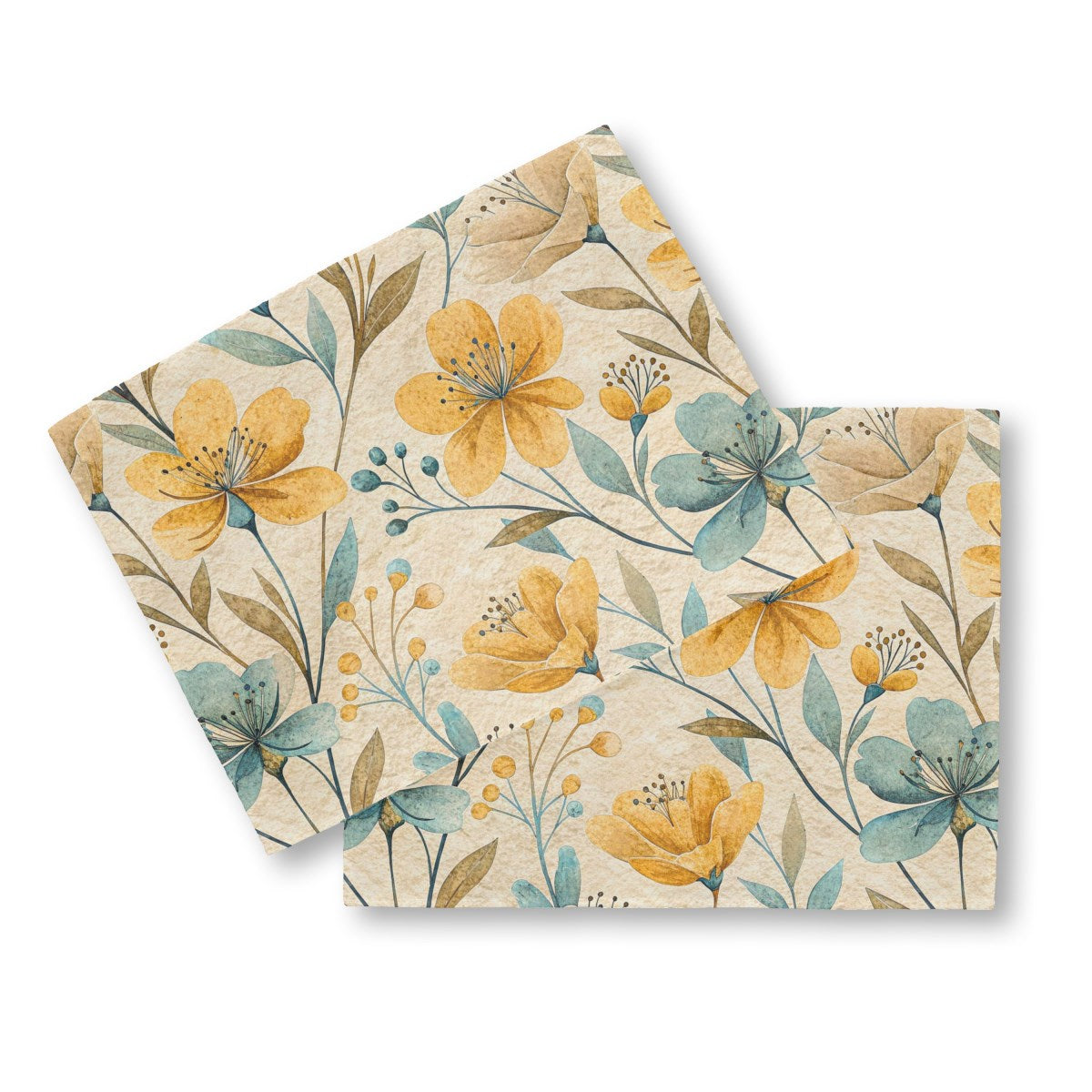A rustic, watercolor-style floral pattern with a vintage feel. The design features stylized golden-yellow and dusty-blue flowers with delicate leaves and stems in earthy tones, all set against a textured, light beige background.