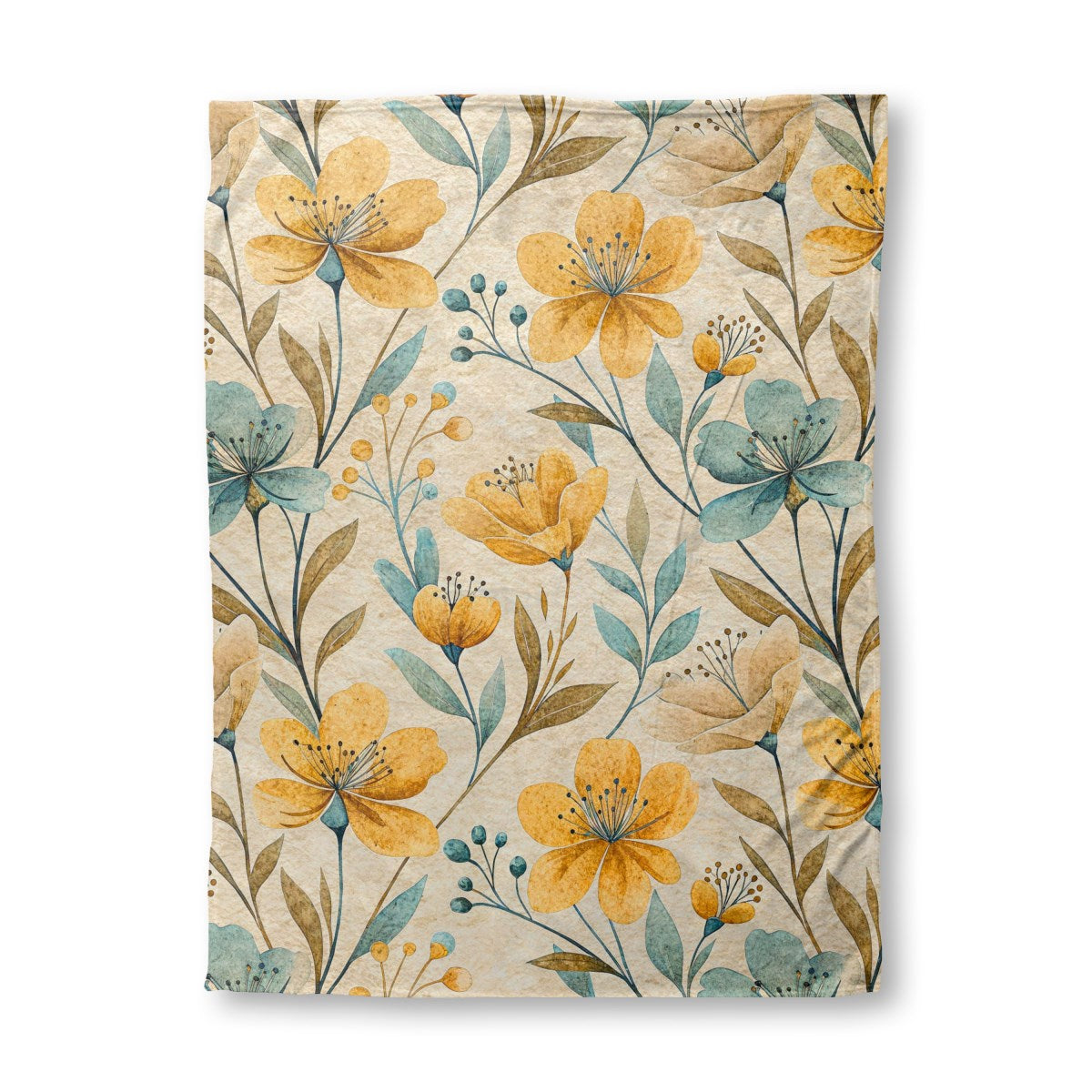 A rustic, watercolor-style floral pattern with a vintage feel. The design features stylized golden-yellow and dusty-blue flowers with delicate leaves and stems in earthy tones, all set against a textured, light beige background.