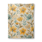 A rustic, watercolor-style floral pattern with a vintage feel. The design features stylized golden-yellow and dusty-blue flowers with delicate leaves and stems in earthy tones, all set against a textured, light beige background.