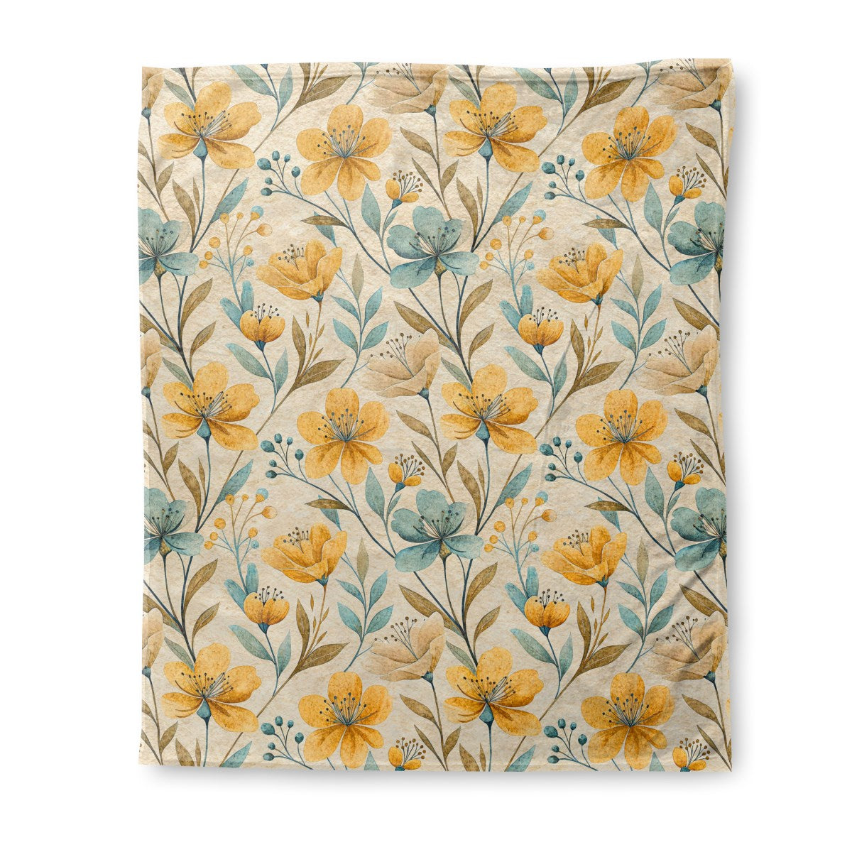 A rustic, watercolor-style floral pattern with a vintage feel. The design features stylized golden-yellow and dusty-blue flowers with delicate leaves and stems in earthy tones, all set against a textured, light beige background.